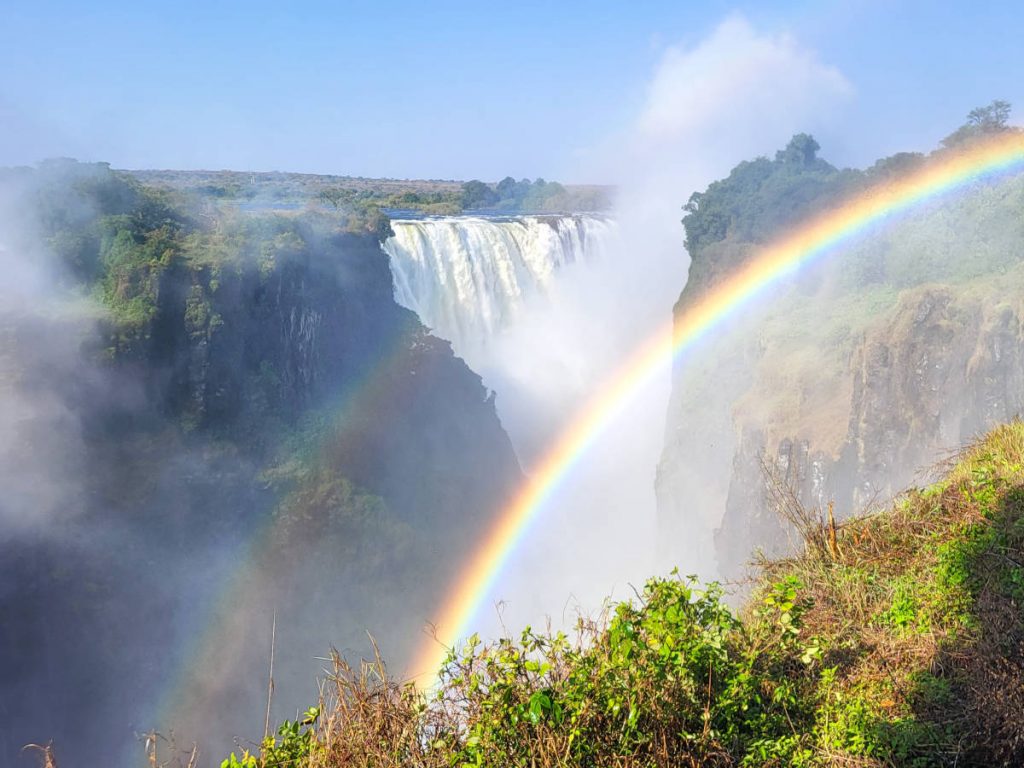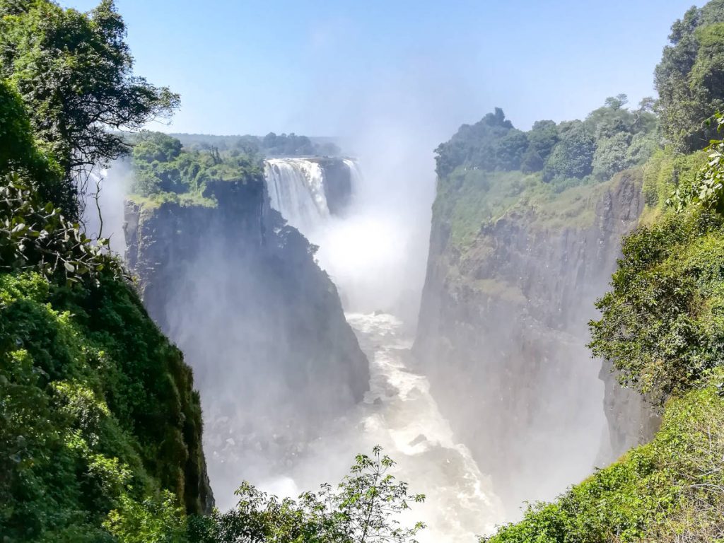Wir verabschieden uns von Botswana und überqueren die Grenze zu Simbabwe. Wir fahren direkt zu den unfassbaren Victoria-Fällen und lassen uns ausgiebig Zeit, die insgesamt 16 Aussichtspunkte abzulaufen. Und dabei werden wir NASS! Denn die Regenzeit ist gerade erst zu Ende gegangen, und der Sambesi führt noch sehr viel Wasser. So sind die Fälle ganz besonders gewaltig. Über 1,7 km ist die Schlucht lang, in die der Sambesi hier stürzt – und nur gut 50m breit! Wir kommen also richtig nah dran an die 110m tiefe Absturzkante dieses Weltwunders. Auf diese Art frisch geduscht beziehen wir anschließend unser Camp, das nur 600m Luftlinie von den Fällen entfernt liegt. Begleitet vom Rauschen erkunden wir das Touristen-Städtchen Victoria Falls und kochen unser Abendessen.