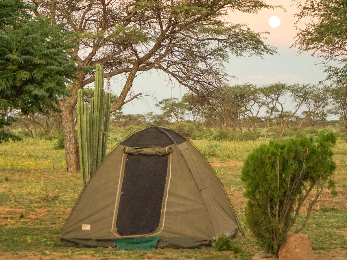 Wenn du die Camping-Option gebucht hast, baust du dir an den genannten Orten dein Zelt selbst auf. Die Zelte sind sehr robuste Kuppelzelte, in deren Mitte man sogar stehen kann. Die Matratzen sind etwa 7cm dicke Schaumstoff-Matratzen, die erstaunlich bequem sind (schreibt ein Seitenschläfer). Nur deinen Schlafsack musst du selbst mitbringen, und wir empfehlen auch ein Bettlaken oder Tuch, um es auf die Matratze zu legen. Alle Campingplätze (außer im Khwai Gebiet) sind umzäunt, sodass du keine gefährlichen Tiere zu fürchten hast. Die Zelte selbst sind mit Moskitonetzen ausgestattet und haben neben einer Eingangstür auch 2 Fenster. Alle 3 dieser Öffnungen kann man auch komplett verdunkeln. Auf allen Campingplätzen gibt es Gemeinschaftseinrichtungen mit Duschen, WC’s und Waschbecken. Der Stil kann variieren: Mal sind es eigene Badezimmer, mal separate Kabinen für Toiletten und Duschen.