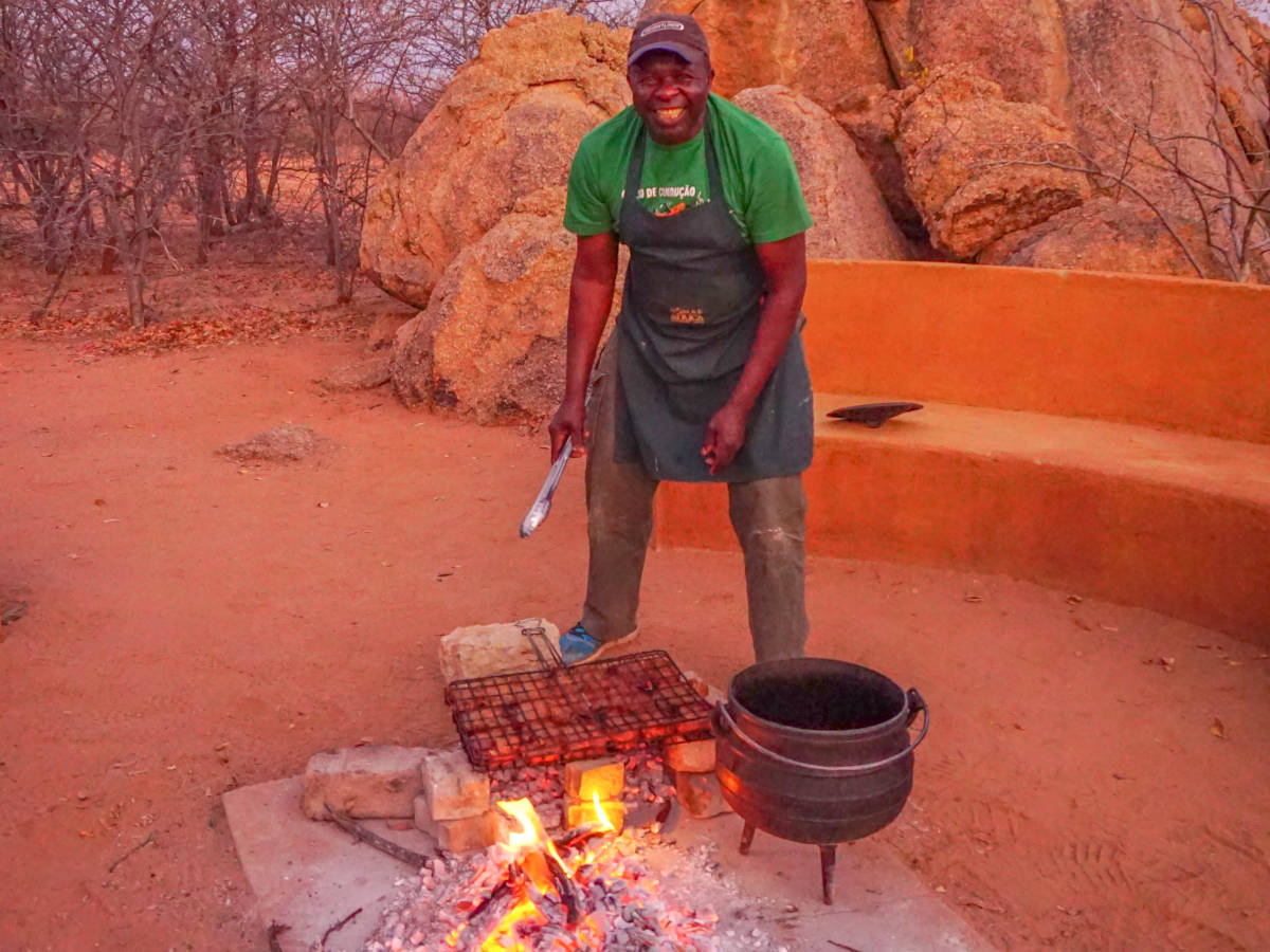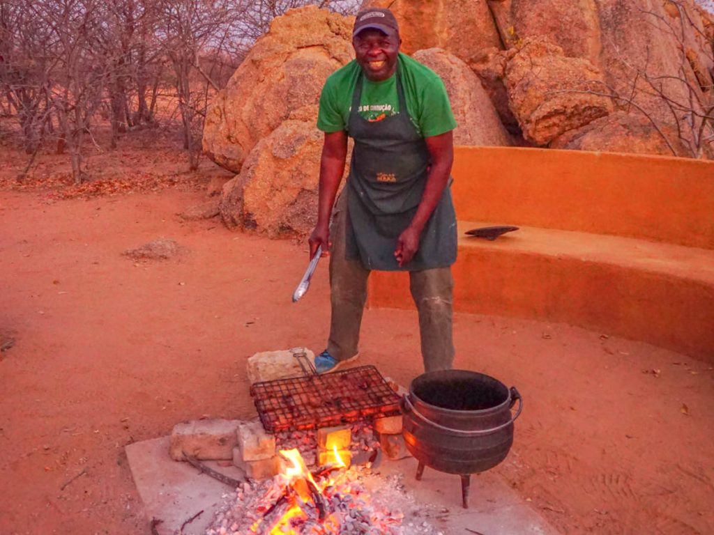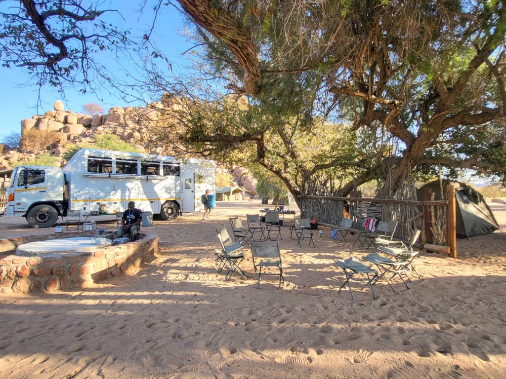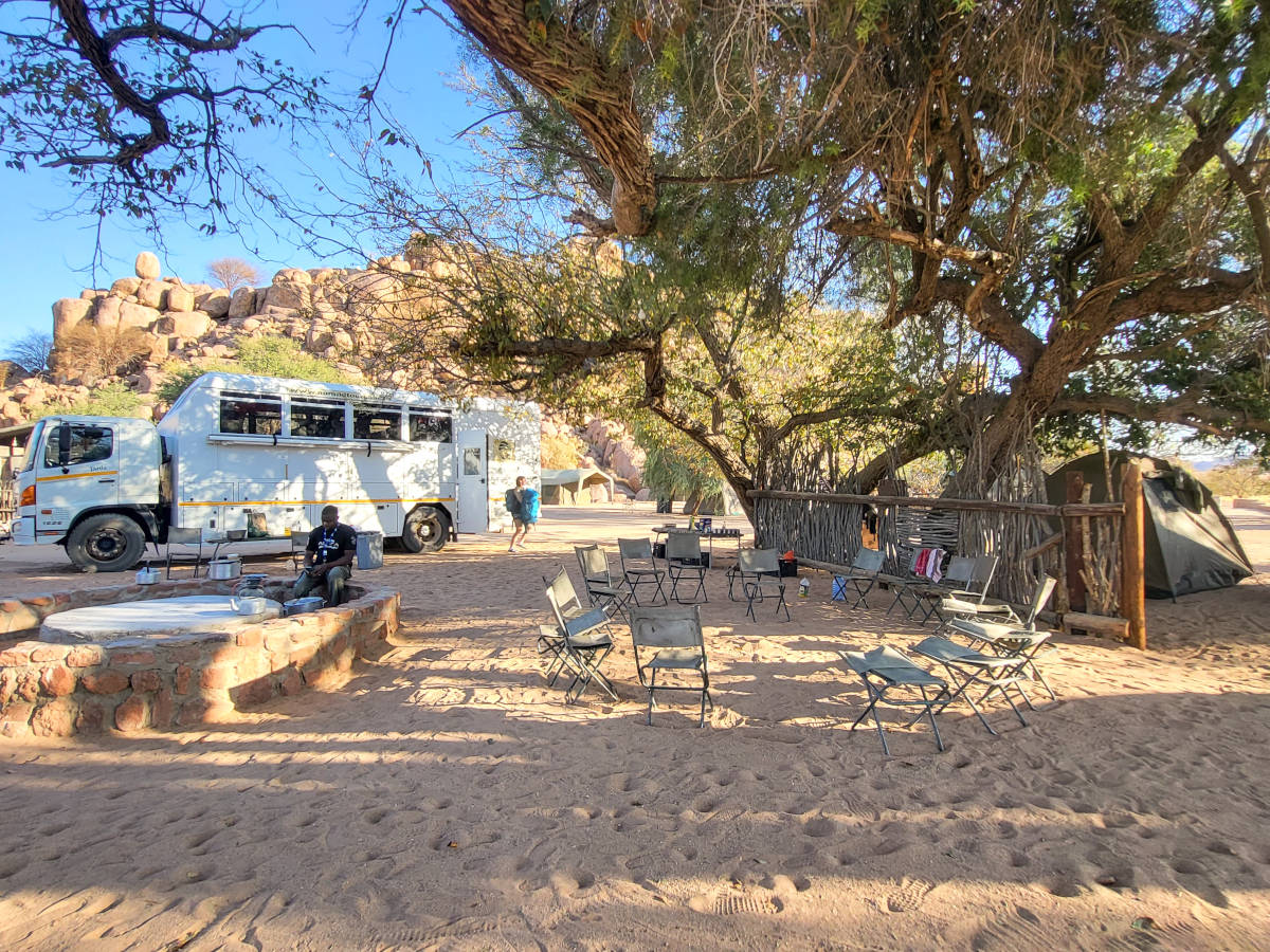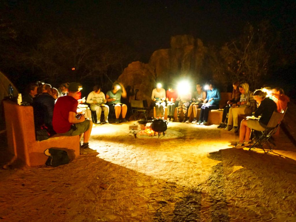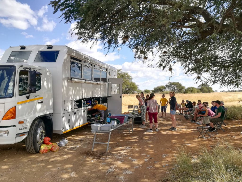 Wir reisen mit unserem eigenen Koch, der für unsere Vollpension sorgt. Das Frühstück besteht meist aus Rührei, Toast, Aufschnitt und Müsli. Mittags wird variiert: Mal kochen wir vor, mal gibt es Nudelsalat, mal Sandwiches, mal Burger, oder etwas anderes. Der Fokus liegt aber vor allem auf dem Abendessen. Das südliche Afrika ist aufgrund der Wüstenklimate weniger auf Gemüse und mehr auf Fleisch ausgerichtet. Vegetarische Optionen gibt es aber selbstverständlich trotzdem, und auch auf Lebensmittelunverträglichkeiten kann eingegangen werden. Es gibt Eintöpfe, Salate, Gemüse, Beilagen und es wird gegrillt was das Zeug hält. Bei allen größeren Mahlzeiten werden 1-3 Personen benötigt, die beim Schnibbeln helfen. Und ebenso finden wir nach jeder Mahlzeit ein Abwasch-Team oder waschen unsere Teller einzeln ab, nachdem wir fertig sind. Auch beim Camp-Aufbau wird immer ein wenig Hilfe benötigt (Tische und Stühle aufstellen). Viel Arbeit ist es nie, aber immer ein fröhliches Miteinander.