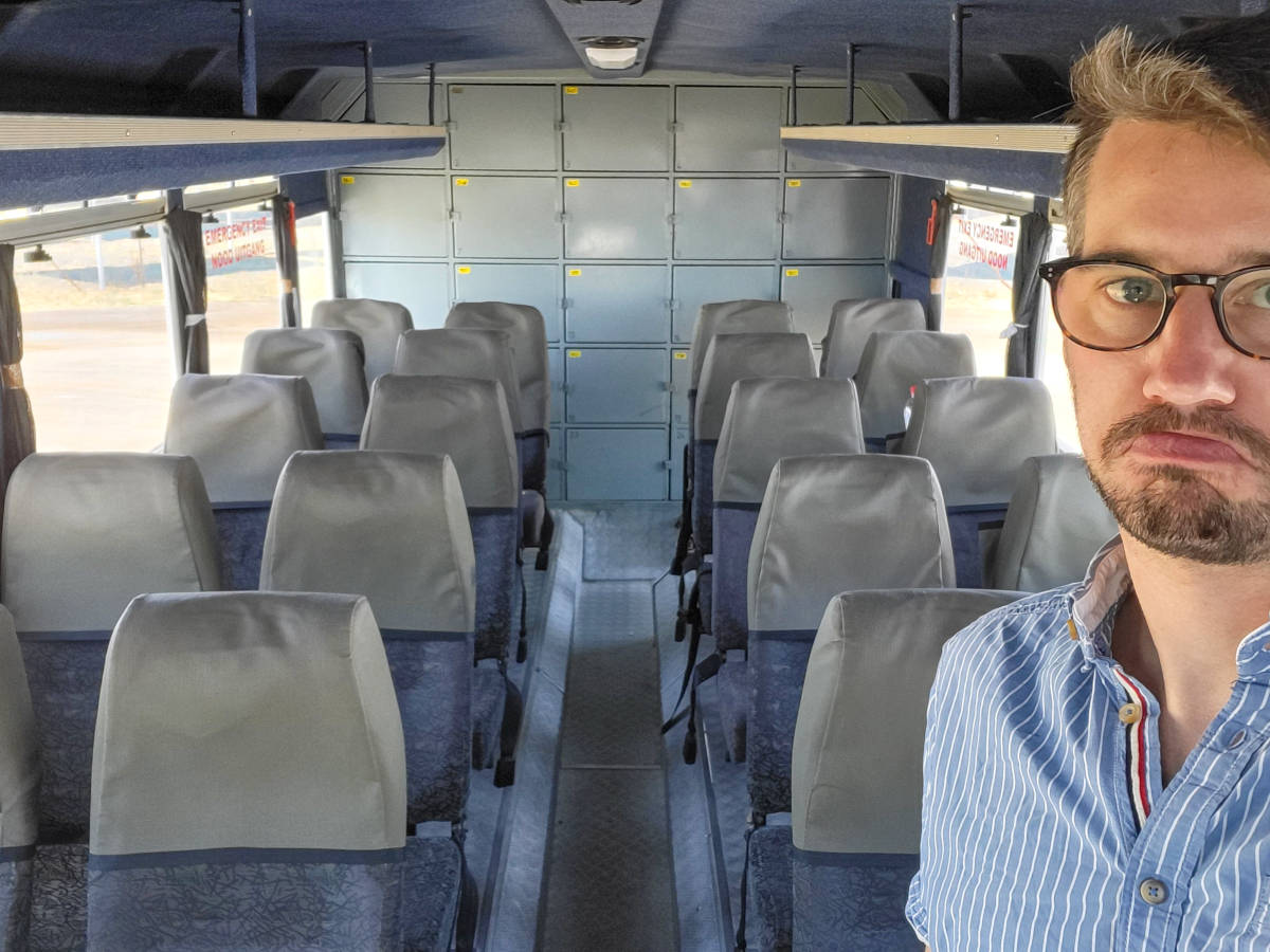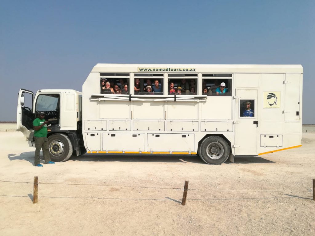 Wir sind mit einem Overlander Truck unterwegs. Darin befinden sich 24 Sitzplätze, 6 davon ganz vorne um den Tiefkühler herum, den man als Tisch nutzen kann. So kann man auf langen Fahrten z.B. Runden zum Karten spielen bilden. Der Tiefkühler ist für den Koch vorbehalten, aber wir haben bei der Tür noch eine Kühlbox zum Lagern von Getränken und Snacks. An allen Plätzen befinden sich USB-Steckdosen. Die Fenster sind groß und lassen sich sowohl komplett, als auch oben nur teilweise öffnen. So kann man den Fahrtwind gut dosieren. Es gibt keine Klimaanlage, aber die Temperatur lässt sich erstaunlich gut regulieren und es ist eigentlich nie unangenehm heiß im Truck. Auch eine Toilette gibt es nicht, aber wir halten regelmäßig an. Ebenfalls im Innenraum befinden sich die Gepäckfächer, die wie liegende Spinde aufgebaut sind und die Maße 42cm x 32cm x 80cm aufweisen. Wir reisen also mit Rucksack oder Reisetasche, nicht mit Koffer. Zusätzlich hat der Truck besonders viel Stauraum, und den brauchen wir auch: Mit dabei sind: Unsere Küche, alle Lebensmittel (die der Koch zwischendurch einkauft), Campingtische, Campingstühle und für alle, die die Camping-Option gebucht haben auch die robusten Zelte und Schaumstoff Matratzen. Mehr dazu unten bei „Camping Option“. Auf dem Foto schaut Thilo übrigens traurig, weil die Gäste gerade abgefahren waren.