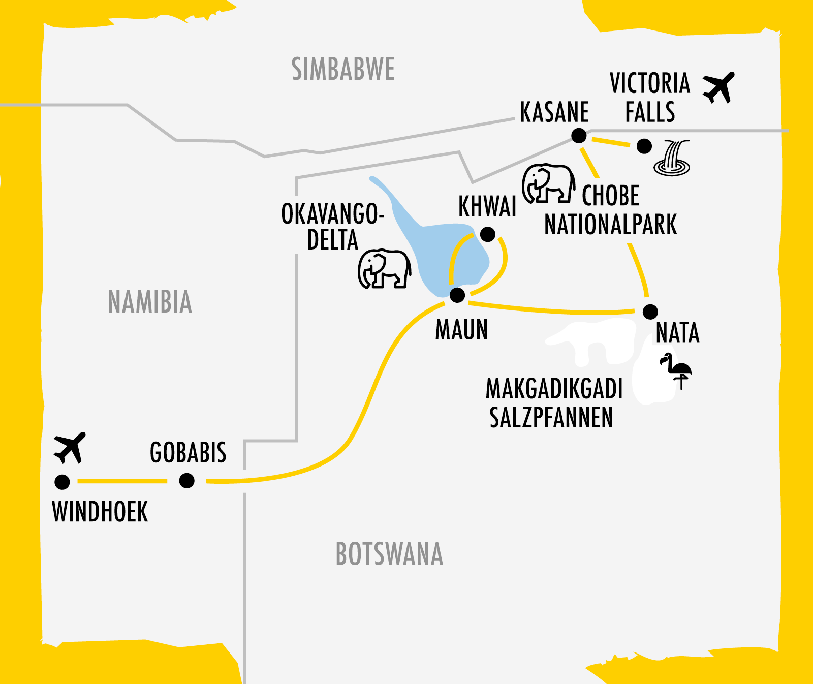 Wir starten in Windhoek in Namibia, denn diese Reise kannst du mir der davor stattfindenden Namibia-Reise kombinieren. Dann fahren wir rüber nach Botswana, direkt zum Okavango-Delta. Das größte Binnendelta der Welt ist ein wahres Naturwunder: Mitten in der Kalahari gibt es hier Wasser im Überfluss. Wir nehmen uns gleich mehrere Tage, um im Khwai Gebiet per Mokoro (Einbaum), Safari-Jeep und optional auch per Flugzeug die Natur und Wildtiere zu erleben. In der Region Nata besuchen wir die riesigen Makgadikgadi Salzpfannen, frühstücken unter Baobabs und besuchen ein lokales Dorf. Weiter im Norden wartet der Chobe Nationalpark auf uns: Auf einer Fluss-Safari fahren wir zwischen Elefanten und Nilpferden, und im Safari-Fahrzeug geht es über die Sandpisten des Parks. Das Highlight zum Abschluss bieten die Victoria-Fälle in Simbabwe. Unterwegs sind wir übrigens in einem Overlander-Truck mit Guide, Fahrer und Koch (Vollpension!).