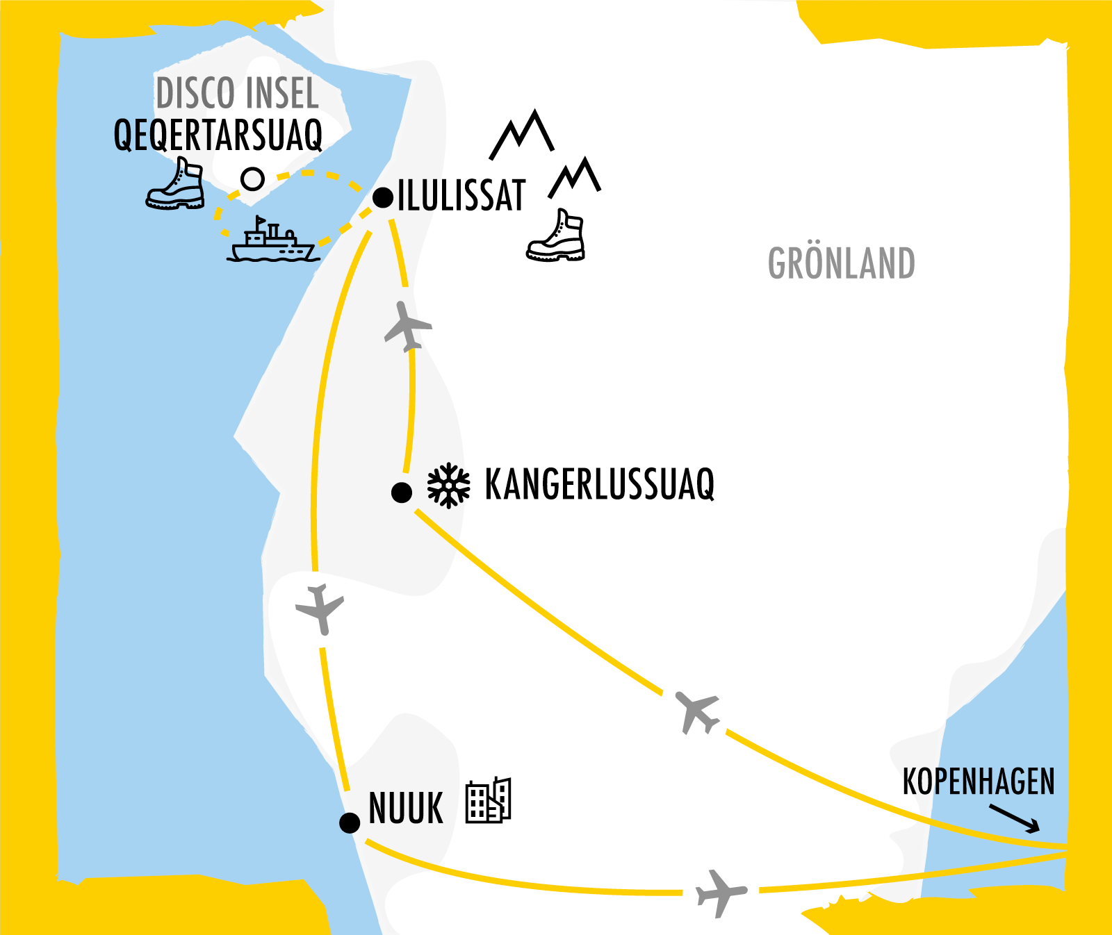 Wir könnten auch nur schnell nach Grönland hüpfen und sagen wir waren da, aber bei uns heißt es „wenn schon, denn schon“: Die Reise startet und endet in Kopenhagen, denn von hier gehen Direktflüge nach Grönland. Natürlich haben wir auch Zeit für die Stadt. Den Auftakt in Grönland macht Kangerlussuaq: Hier verbringen wir einen ganzen Tag auf dem grönländischen Inlandeis – Abenteuer pur zum Auftakt! Weiter geht es nach Ilulissat, was „Eisberge“ bedeutet. Wir unternehmen eine Tageswanderung am berühmten Eisfjord (UNESCO Welterbe) und fahren per Boot dicht an die riesigen Eisberge heran. Mit der Fähre geht es quer durch die Disko-Bucht auf die Disko-Insel nach Qeqertarsuaq. Die Vulkaninsel erkunden wir auf einer Wanderung und im Dorf lernen wir mehr über das ursprüngliche Zusammenleben der Inuit. Zurück in Ilulissat bleibt noch genug Zeit für weitere Ausflüge – wie wär’s mit einer Walbeobachtung? Als letzter Ort wartet die Hauptstadt Nuuk auf uns – politisch spannend geht es ja aktuell zu auf der größten Insel der Welt! Immer mit dabei ist deine My Gap Week Reiseleitung. Gemeinsam erkunden wir die größte Insel der Welt, essen bei einer lokalen Familie zu Abend, probieren lokale Spezialitäten, erfahren mehr über die besondere Kultur der Inuit, wohnen in hervorragenden Hotels und erleben die wilde Natur dieses unfassbaren Landes.