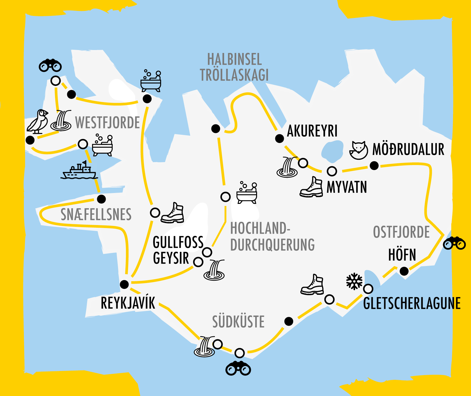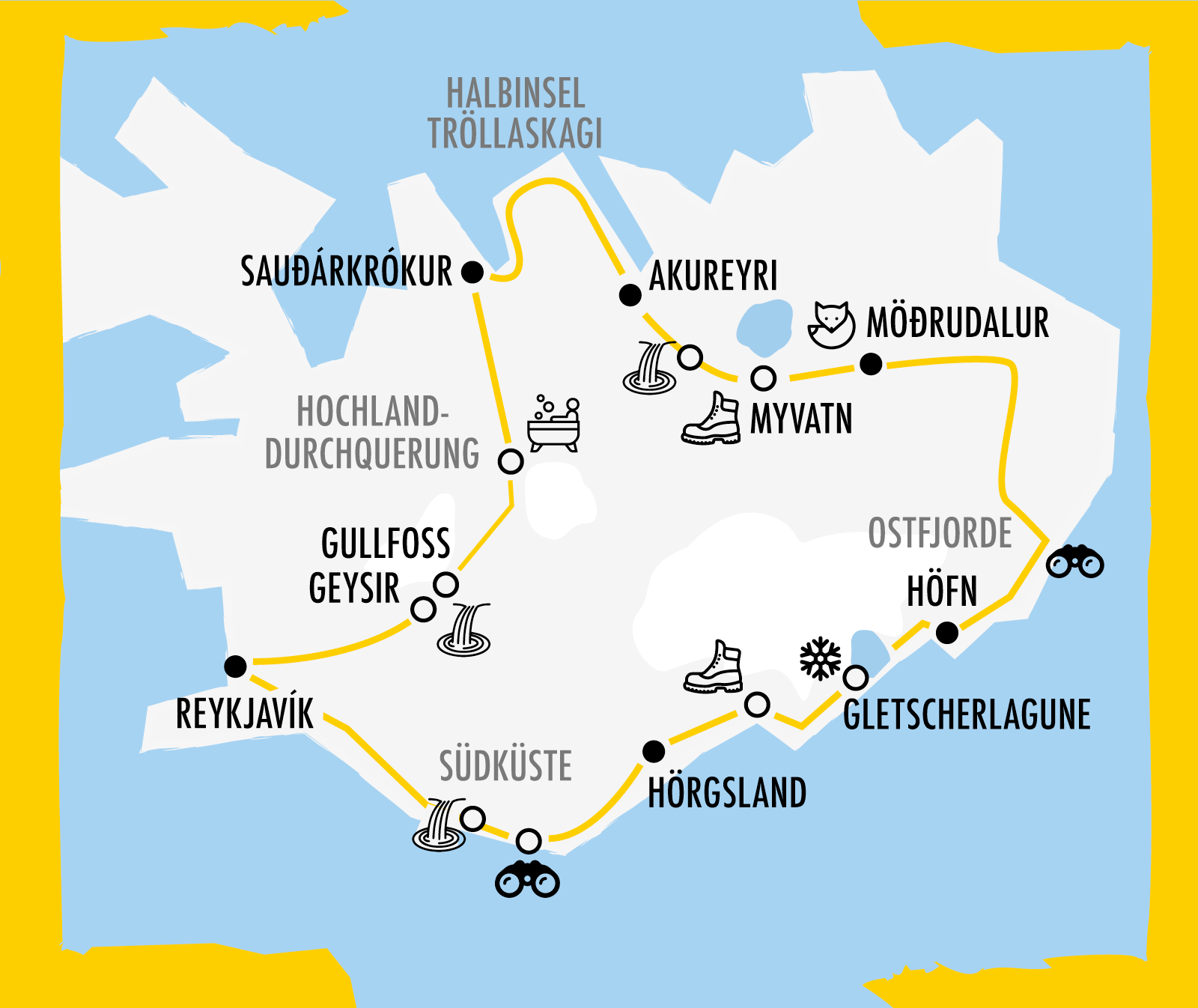 Los geht es gleich mit einem Kracher: Von Reykjavik aus geht es zuerst zum gewaltigen Wasserfall Gullfoss, und dann quer durch’s isländische Hochland! Auf der Kjölur Piste geht es von Süd nach Nord, mit einem Badestopp in der Hochland-Oase Hveravellir. Dann machen wir den Norden unsicher: Zunächst geht es off-the-beaten-track um die Halbinsel Tröllaskagi und zum Fischerdorf Siglufjördur. Anschließend erkunden wir den Rest des Nordens: Das süße Örtchen Akureyri, die Wasserfälle Godafoss und Dettifoss und das vulkanische Wandergebiet Myvatn. Auf wunderschönen Strecken geht es durch die Ostfjorde, und im Süden warten der größte Gletscher Europas, der Diamond Beach und die Gletscherlagune auf uns. Die Wasserfälle und Klippen der Südküste runden die Runde ab, dann sind wir wieder in Reykjavík.