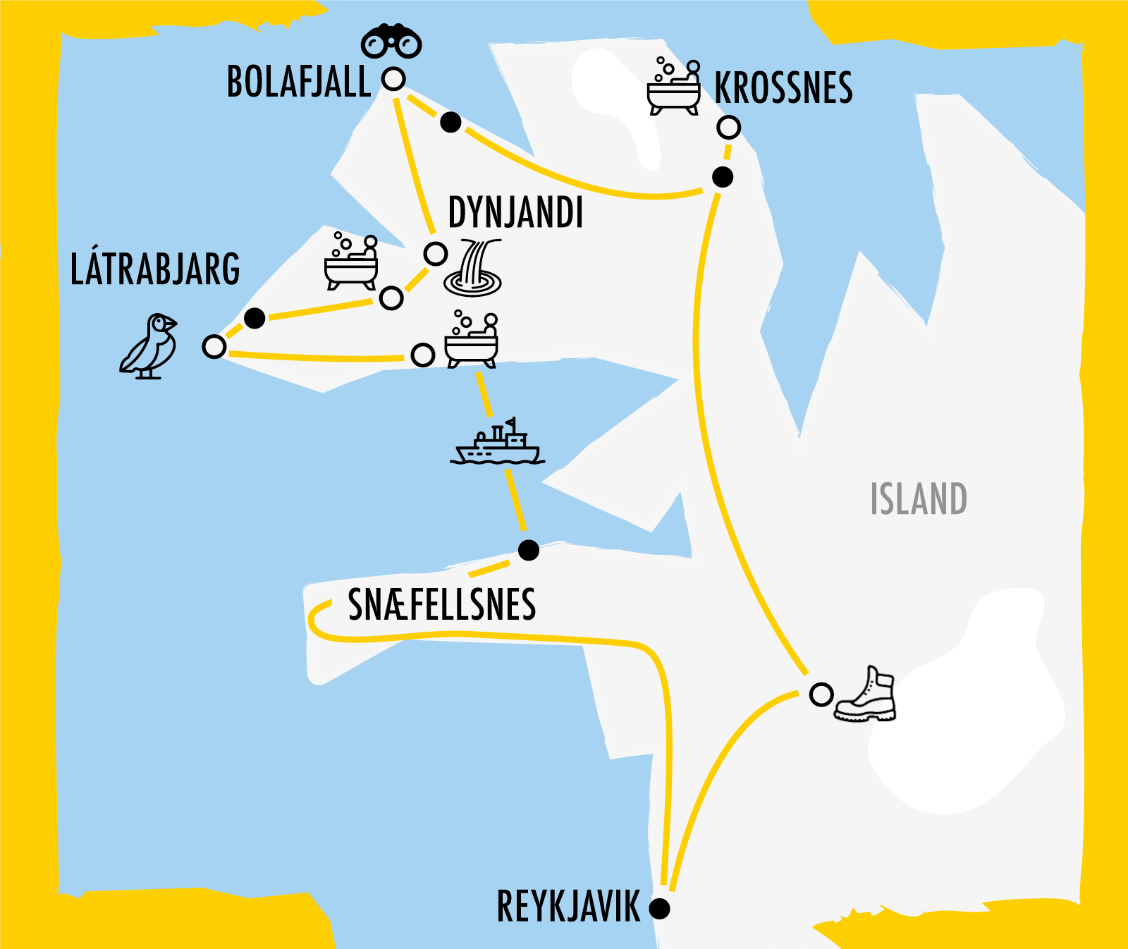 Wir wissen gar nicht wo wir anfangen sollen. Eine „Badereise Island“ (Hot Pot Tour) stand schon lange auf dem Plan, deswegen gleich vorweg: Hier wird gebadet, was das Zeug hält, denn die Zahl der unfassbar schönen Geothermalbäder in den Westfjorden ist enorm. Wir starten mit dem „Krossneslaug“ gleich mit einem Highlight und übernachten im abgefahrenen Ort Djúpavík. Wir fahren entlang der Fjorde durch die Wildnis und reisen auf über 66 Grad Nord. Wir besuchen den gewaltigen Wasserfall Dynjandi und wandern auf die größte Vogelklippe Islands zu Papageitauchern und co. – mitten in der Haupt-Brutsaison. Per Fähre geht es zum krönenden Abschluss noch auf die Halbinsel Snaefellsnes, der wir zum Abschluss einen ganzen Tag widmen.